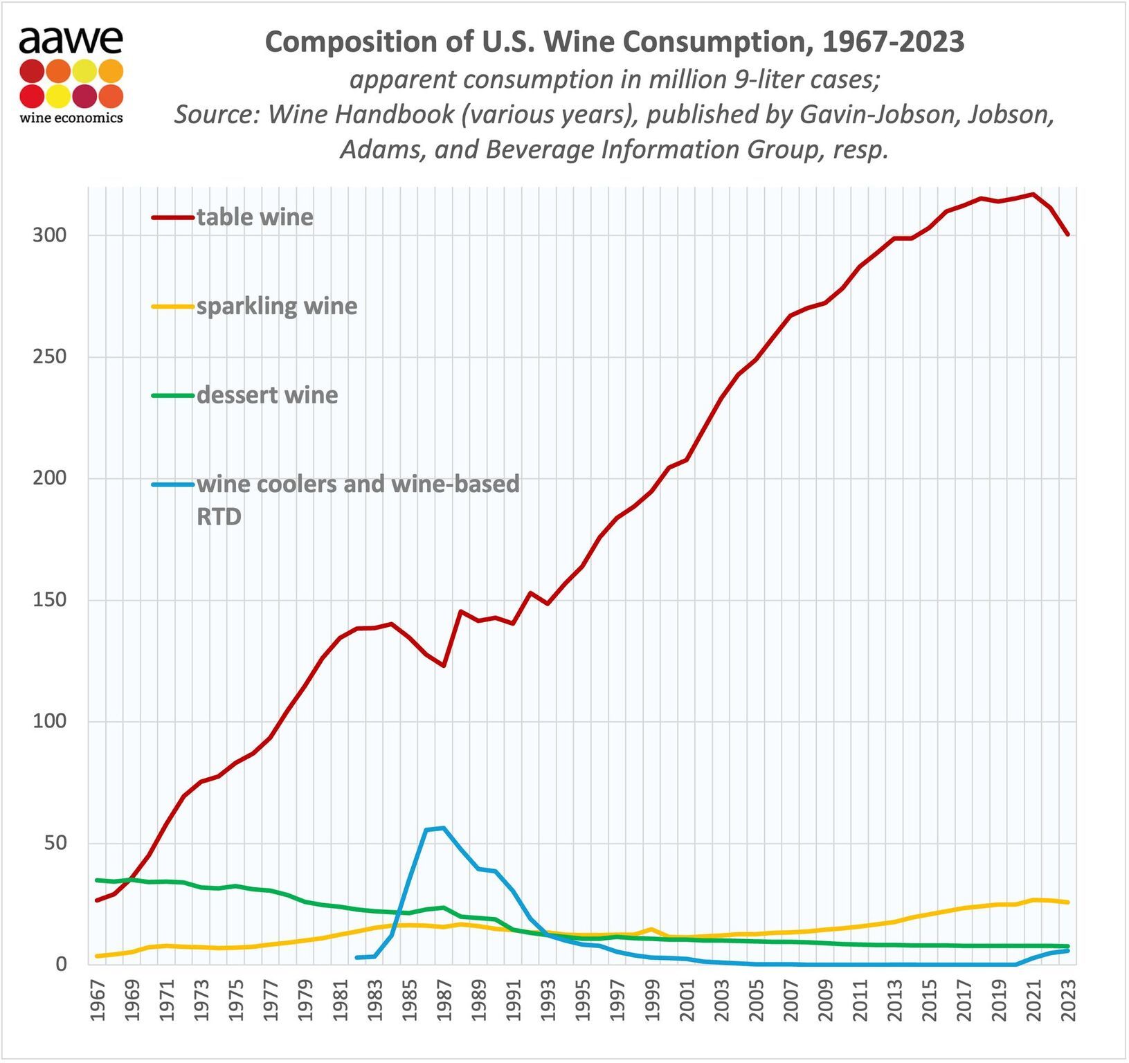 Composición del consumo de vino en EE. UU., 1967-2023.