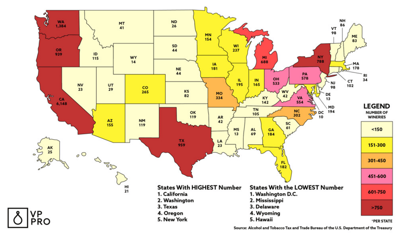 Según Vinepair hay más de 17.000 bodegas en Estados Unidos. En California hay más de 6.000. Aquí puedes ver cuantas tiene cada estado: