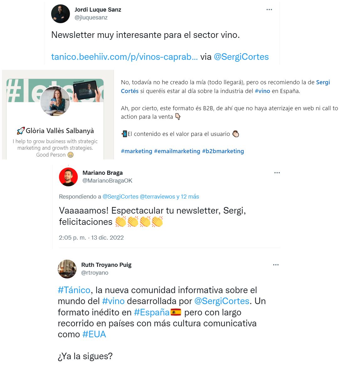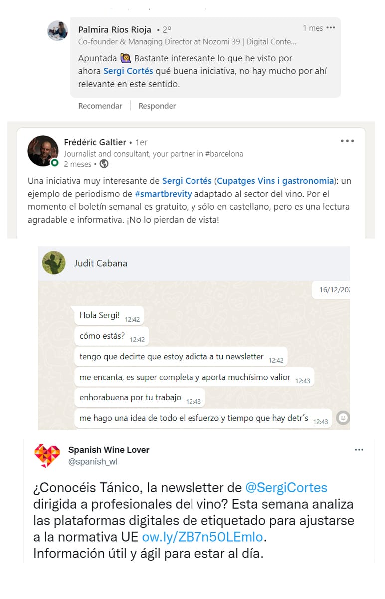 No había ninguna Newsletter B2B en el sector del vino en España y pensé que podría ser interesante hacer una. Disparé el primer Tánico el pasado 11 de octubre. La leyeron 85 personas. Dos Tánicos más tarde, el 25 de octubre, te hablé del caso de éxito de Giró Ribot con su gama Mimat y de como entró en Caprabo. Todo con facturaciones y botellas vendidas. Tuvo 130 lecturas, lo que me llevó a pensar que los casos de éxito gustan.