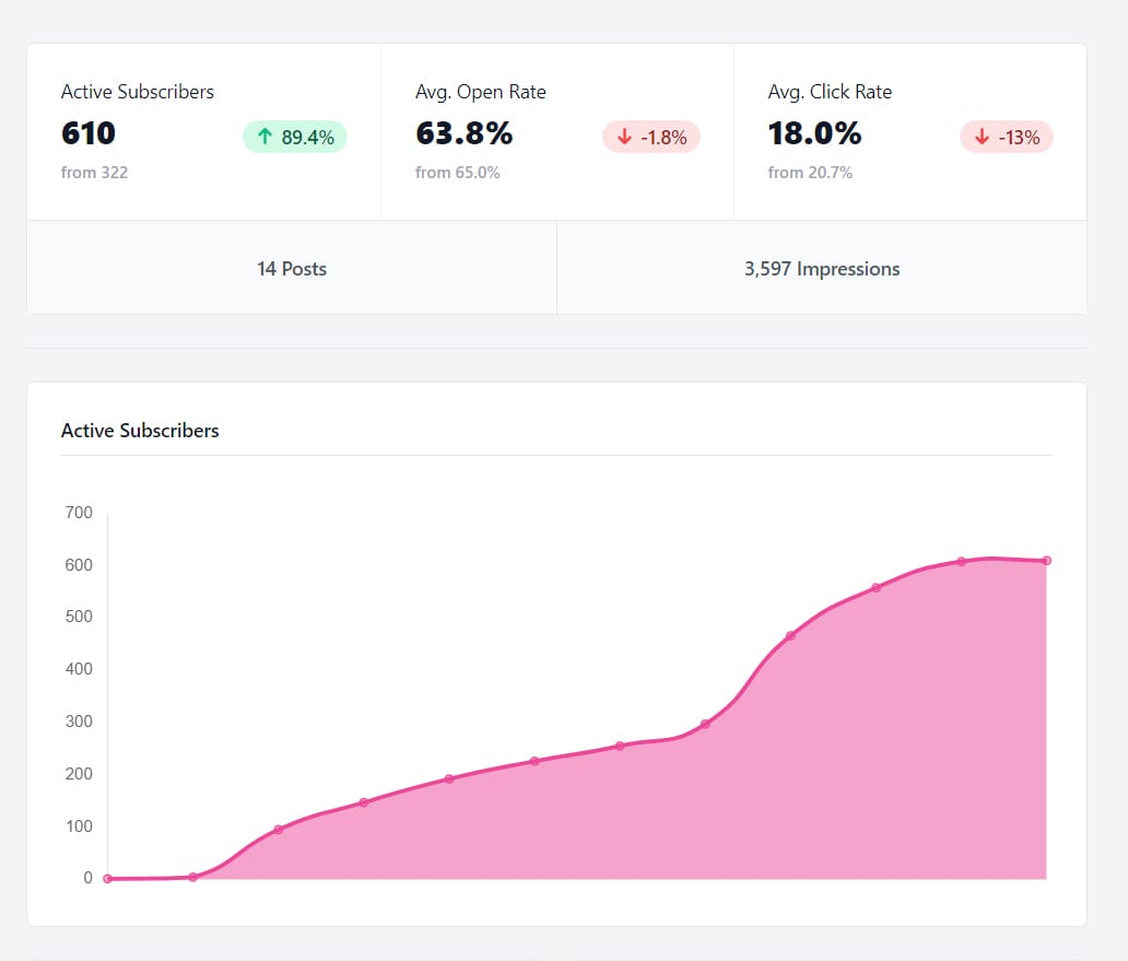Hoy, Tánico tiene 610 suscriptores con una tasa de apertura media del 63,8% y creciendo a una media de 60 nuevos suscriptores a la semana. 💪💪💪