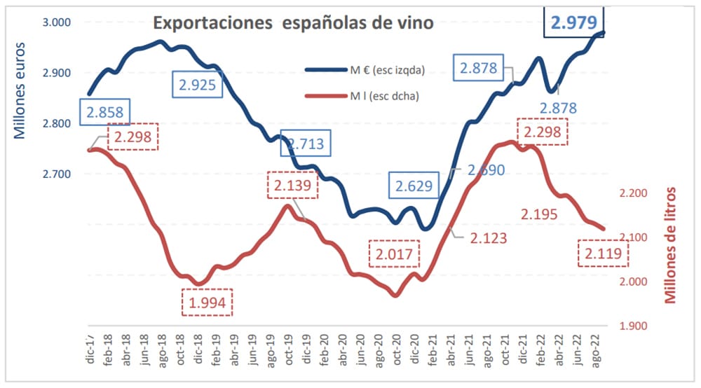 Este 2022 crecen las exportaciones en valor y disminuyen en volumen según el OeMv. Sube el precio medio del litro de vino español exportado. España ha facturado 100 M€ más exportando 179 M de litros menos (datos hasta septiembre 2022).El precio por litro de las exportaciones españolas queda, de momento, en 1,4 €/litro.