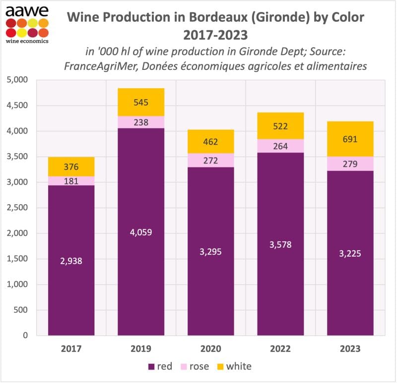 Evolución de la producción por tipo de vinos (color) en Bordeaux. Fuente: AAWE