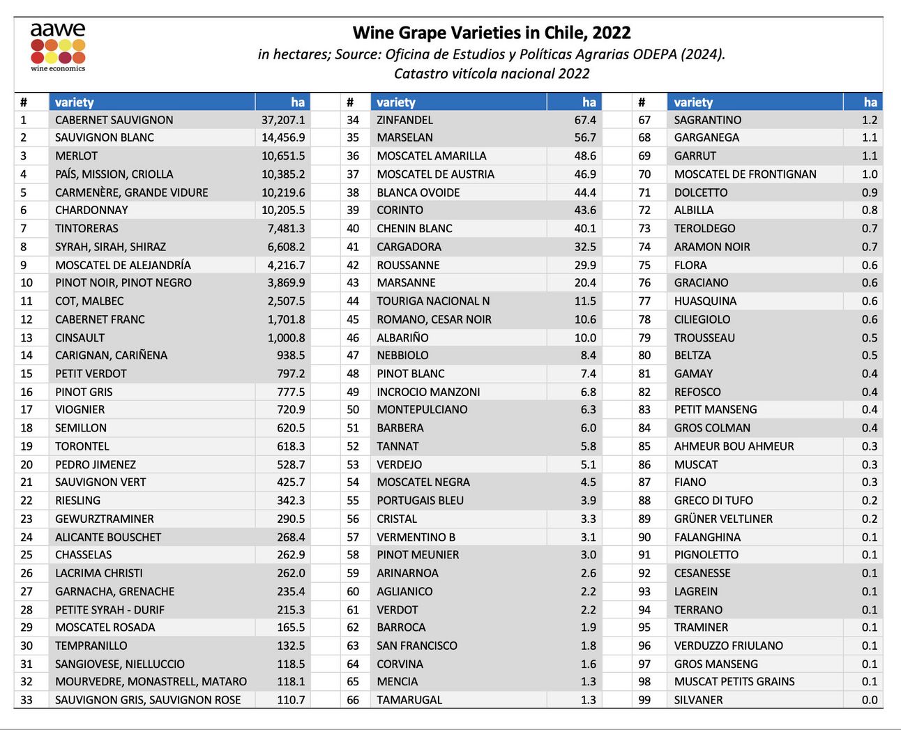 Las variedades de uva en Chile, en hectáreas. Fuente: AAWE