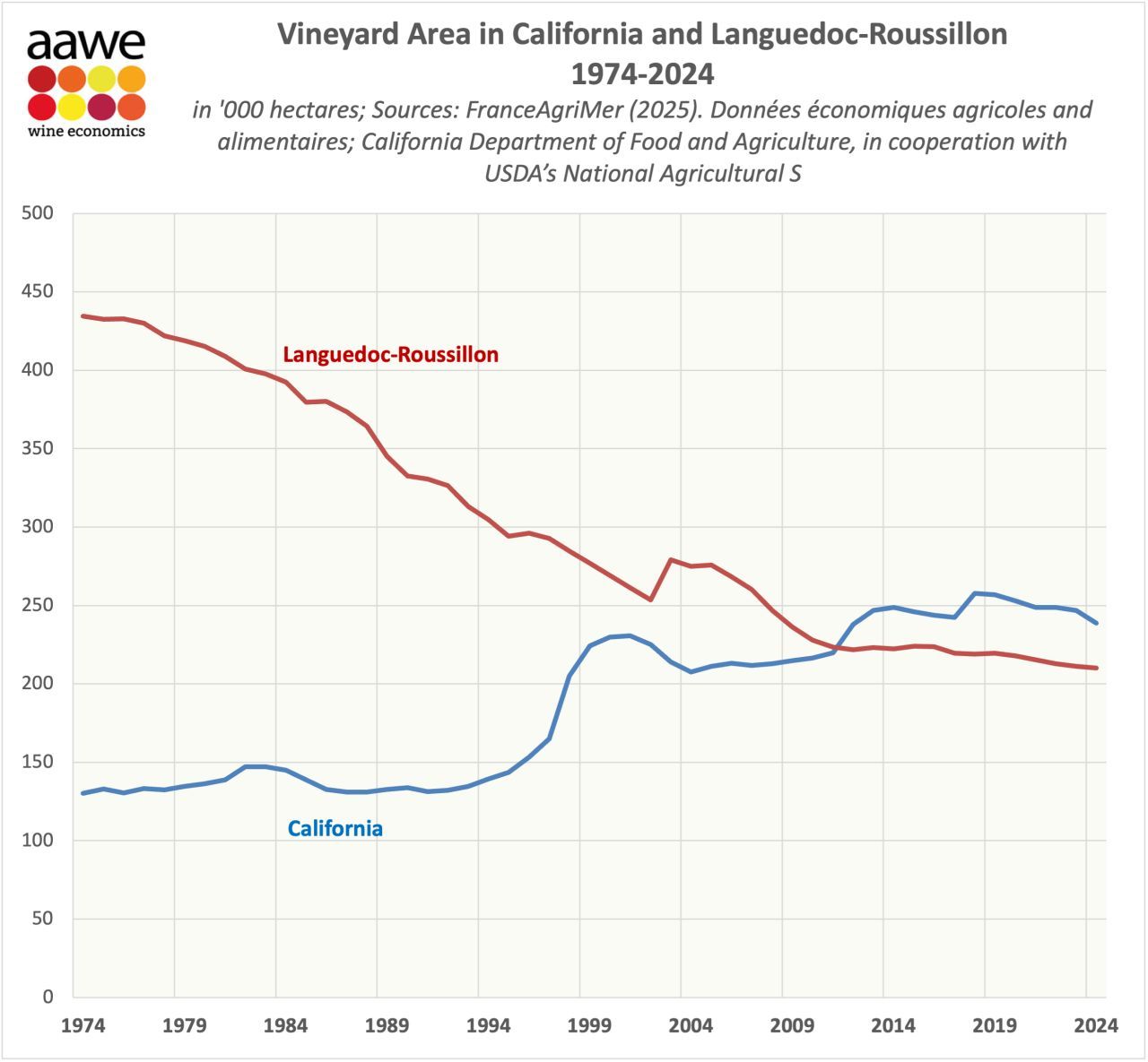 Evolución de la superficie de viñedo de California y de Languedoc-Roussillon.