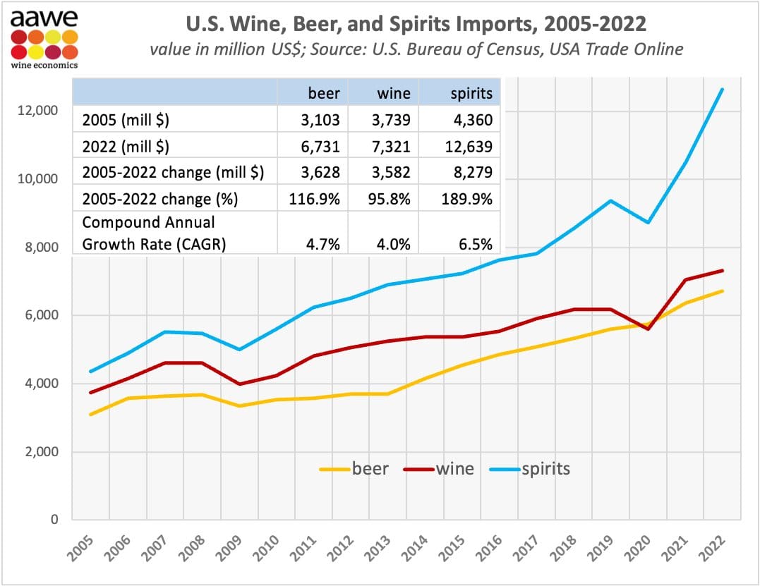 Importaciones de licores, vino y cerveza en EE.UU. del 2005 al 2022.