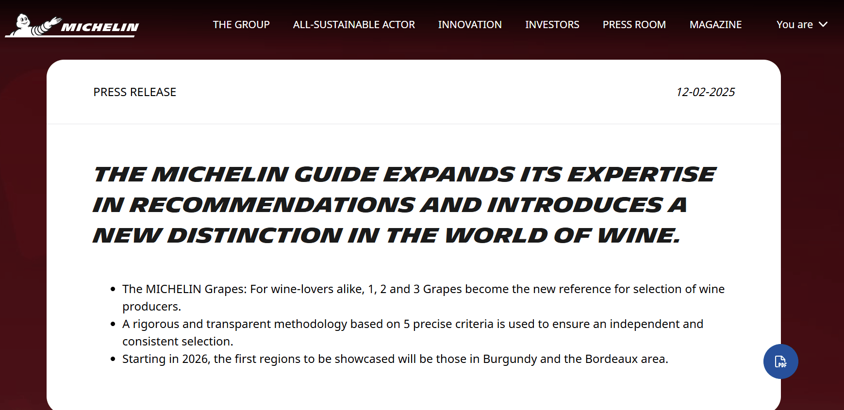 Michelin lanzará en 2026 “Michelín Grapes”, un sistema de 1 a 3 uvas para premiar a las bodegas.