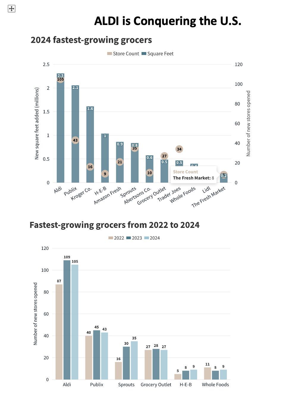 ALDI, retailer internacional de alimentación y gran consumo, es la tienda de comestibles que crece más rápido en EE. UU., en puntos de venta y en metros cuadrados. Abrió 105 tiendas en 2024.