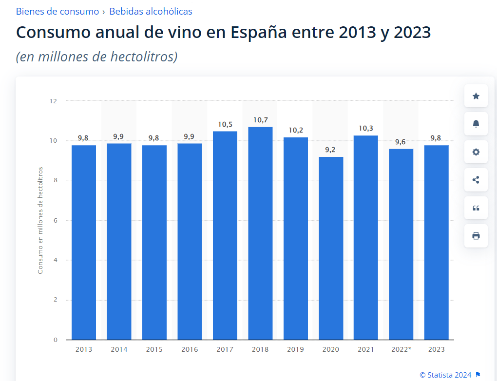 Gráfico evolutivo del consumo de vino en España. Fuente: Statista